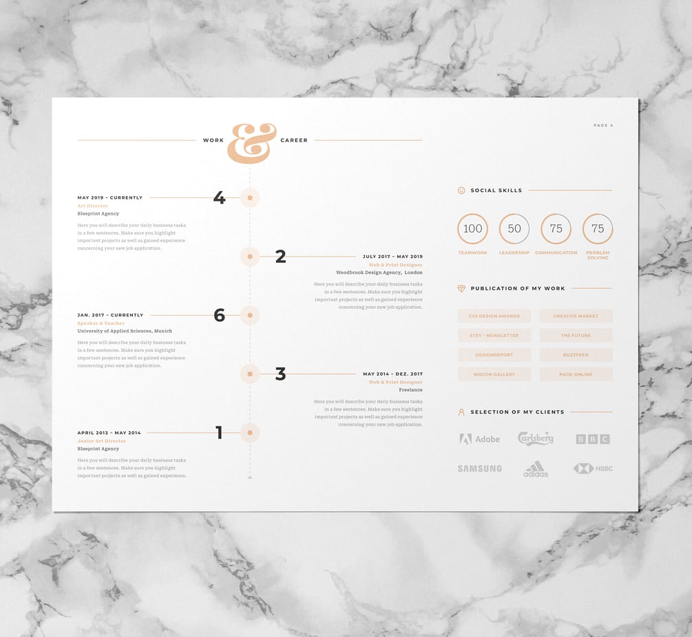 Due to the use of infographic elements and neat icons this template is a real eyecatcher. It contains two different cover sheets, cover letter, an unique résumé – available in the paper sizes DIN A4 and US letter. The template is tailored to people in the creative space such as architects, graphic designers, fashion designers, product designers and much more. Get the job you deserve!